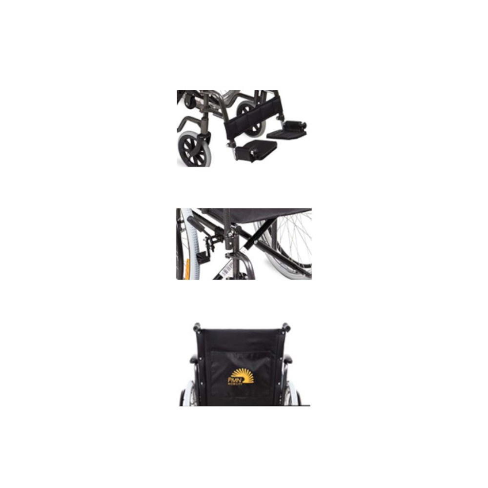 Gli ausili della linea PMN NEOS comprendono carrozzine ad autospinta con telaio in acciaio a crociera singola (PMN NEOS 41/43/45/) e a doppia crociera (PMN NEOS 51), con braccioli desk, pedane smontabili lateralmente con fascia ferma gambe.