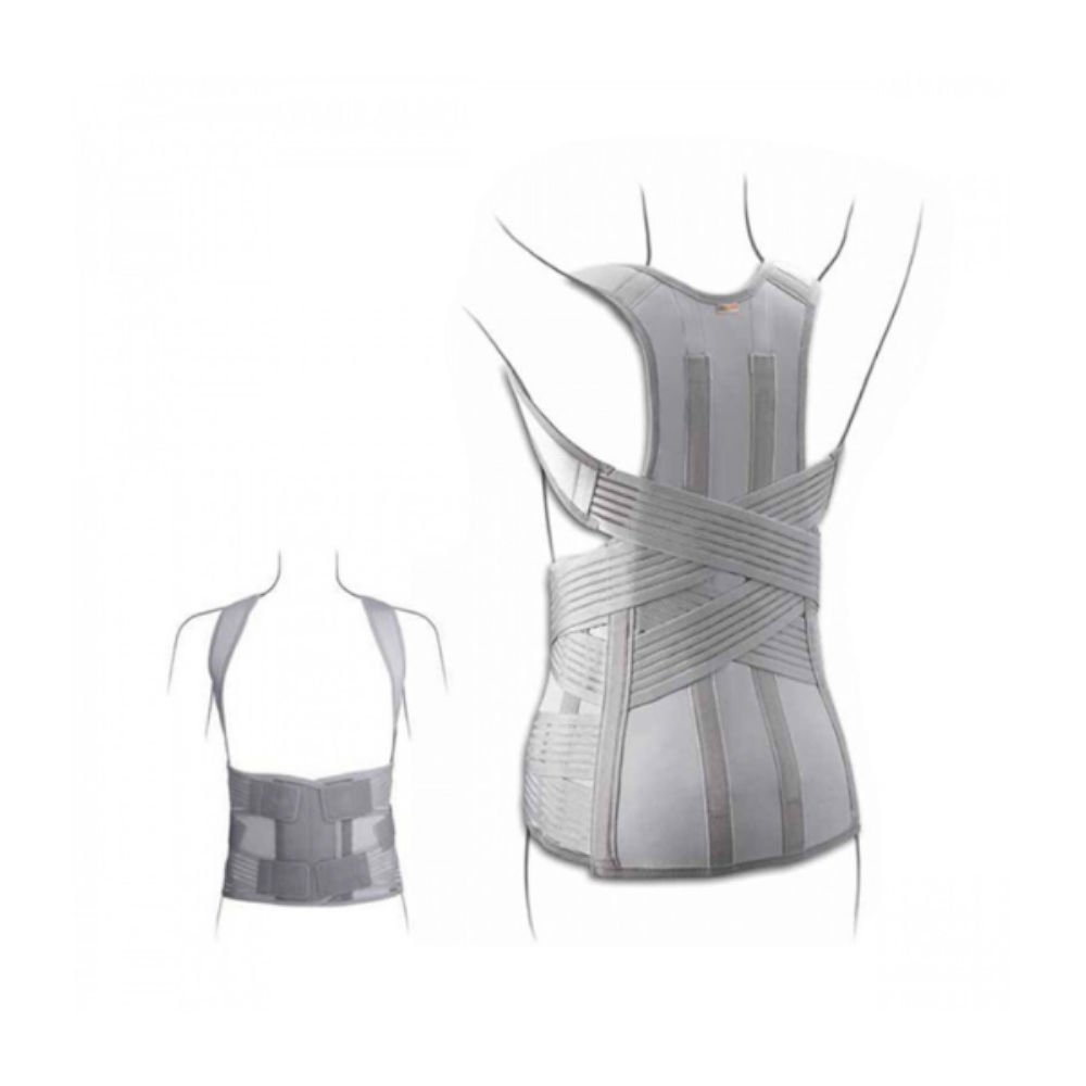 Chiusura anteriore a velcro. Tiranti elastici posteriori per una pressione variabile e personalizzata. Parte lombare sostenuta da stecche modellabili integrate nella fascia (possibilità di inserire stecche più dure per aumentare la rigidezza del corsetto). Zona addominale con rinforzo steccato a spirale in posizione obliqua.